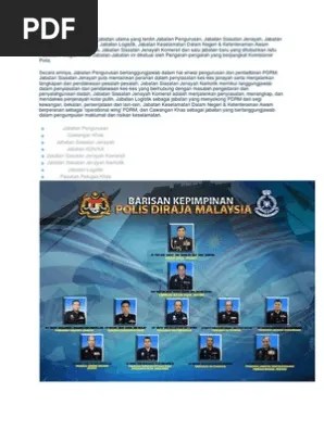 Selamat datang ke portal rasmi polis diraja malaysia. Polis diraja malaysia pdrm hari ini mengumumkan pertukaran jawatan dan kenaikan pangkat 32 pegawai kanannya . Pdrm terbahagi kepada 8 jabatan utama yang terdiri jabatan pengurusan, jabatan siasatan jenayah, jabatan siasatan jenayah narkotik, jabatan logistik, . Koleksi contoh soalan spier ujian dari polis diraja malaysia yang terbaik termasuk carta organisasi pdrm 2022 bagi e pengambilan pdrm.